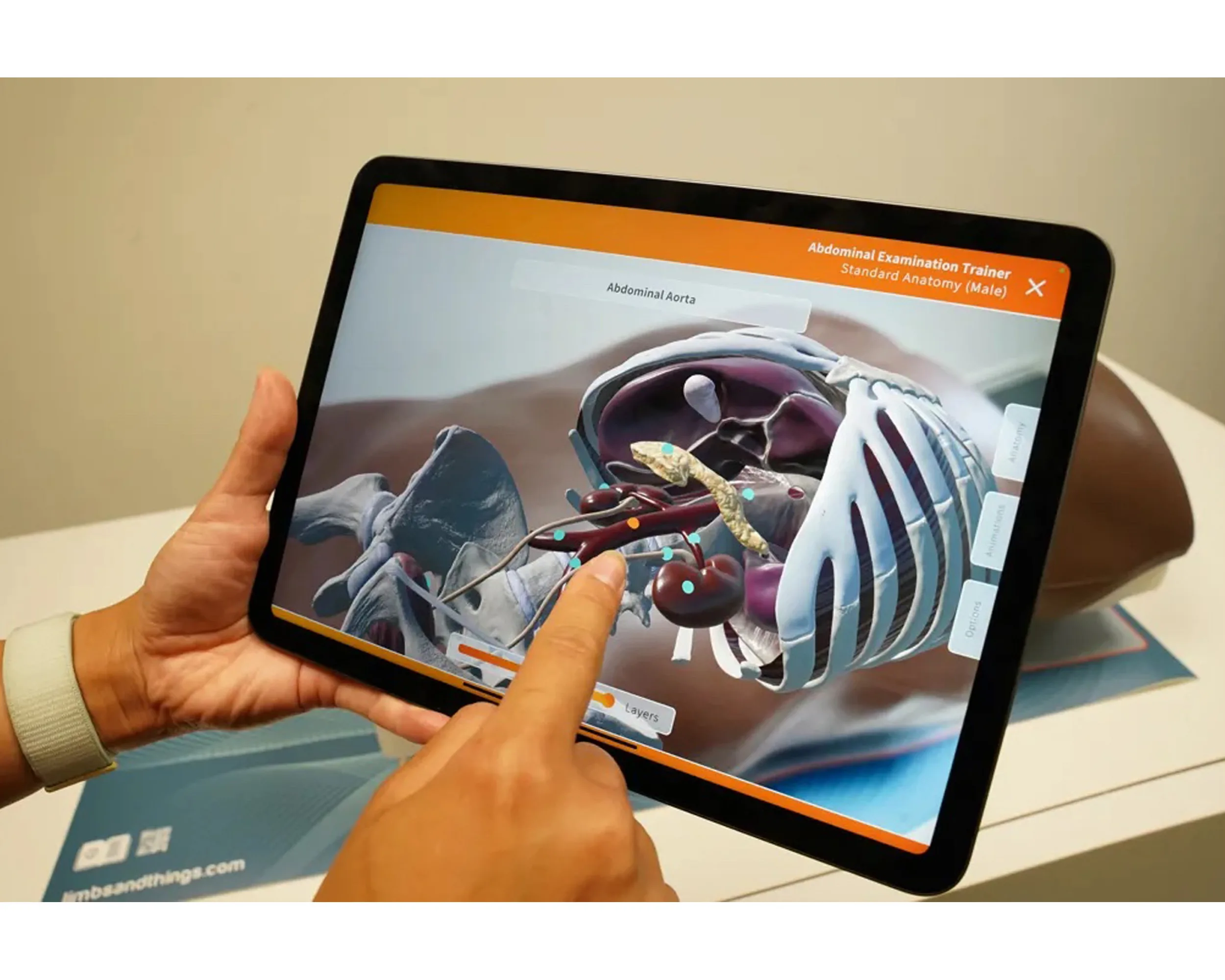 - Within the app’s digital environment, you can move around your task trainer and view various overlays, including: the musculature, organs and vessels, and skeletal structure