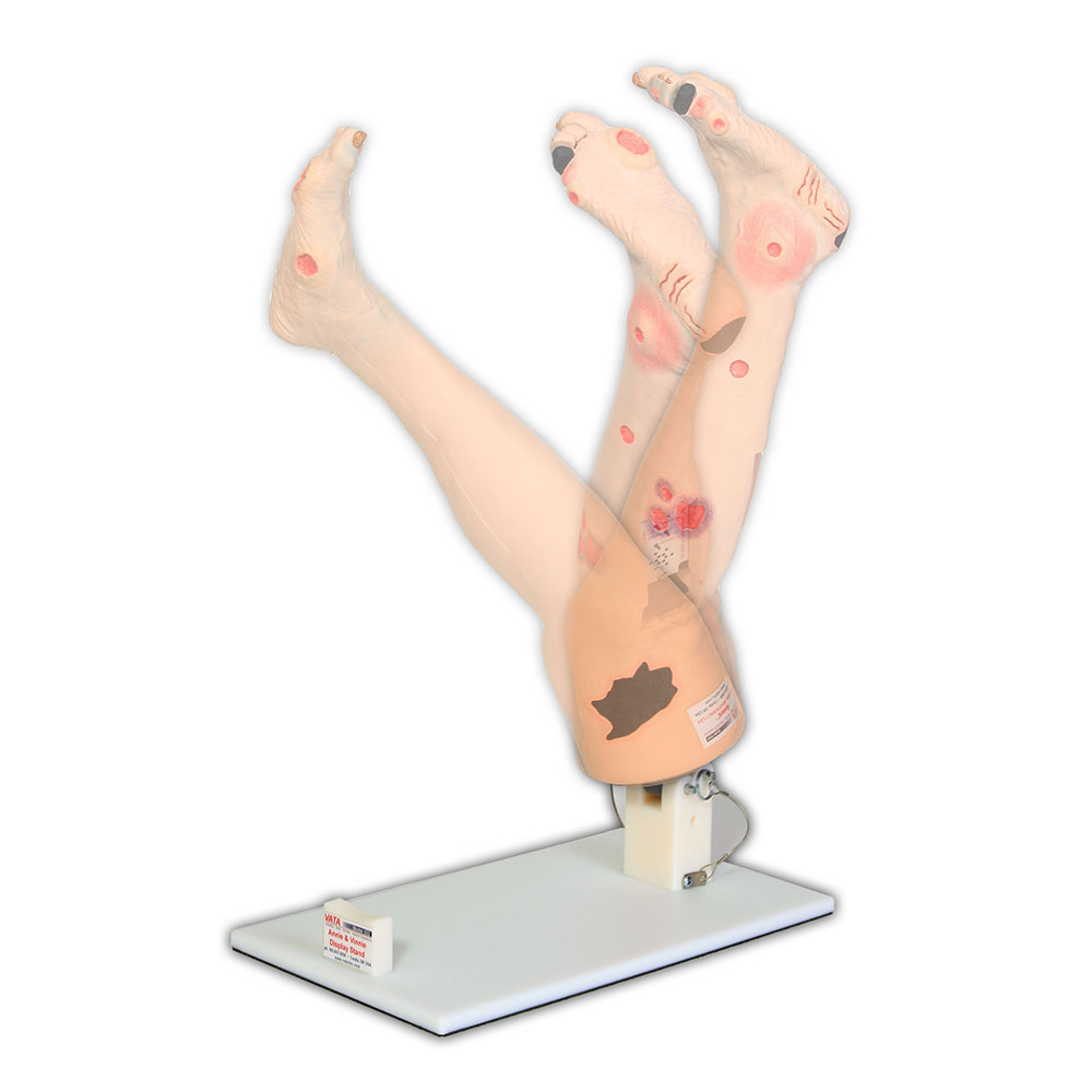 - The display stand permits the leg models to pivot from above the knee, providing a realistic experience in supporting the legs while practicing dressing changes or identifying conditions